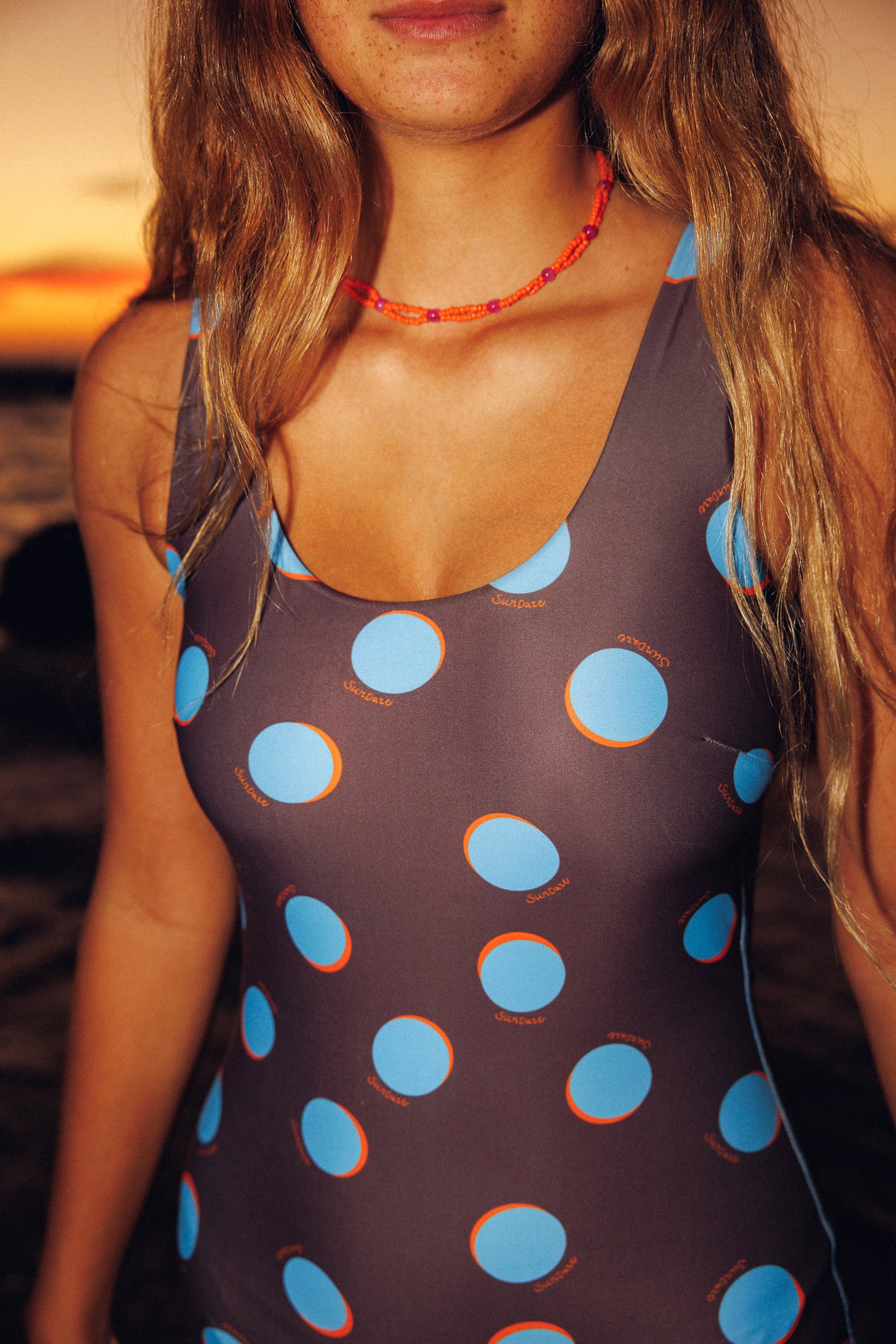 - Dark brown with custom SunDaze blue & orange polka dot print