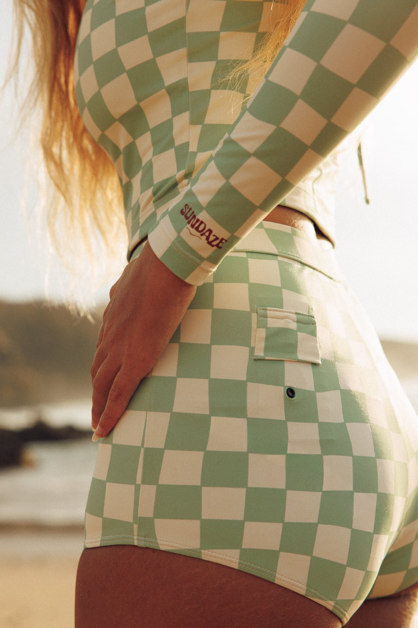 Our surf swimwear is meant to hug the natural curves of your body, as the fabric stretches around 1-3 cm when you take a dip.