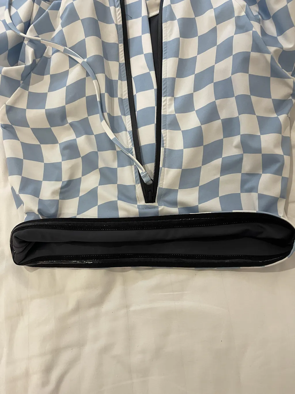 • Women's blue and white checkered print surf rash guard top