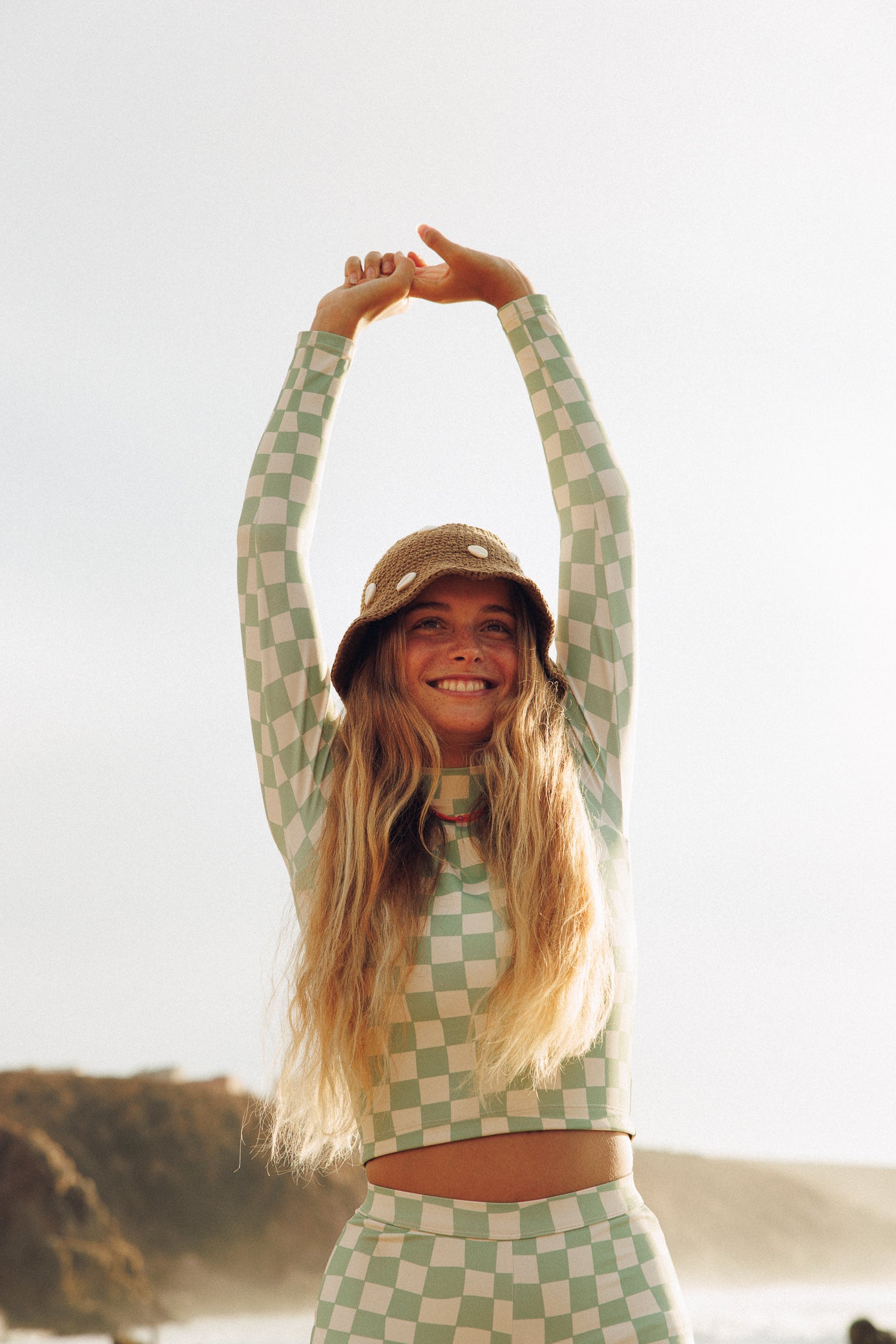 - Women's sage green and beige checkered print rash guard top